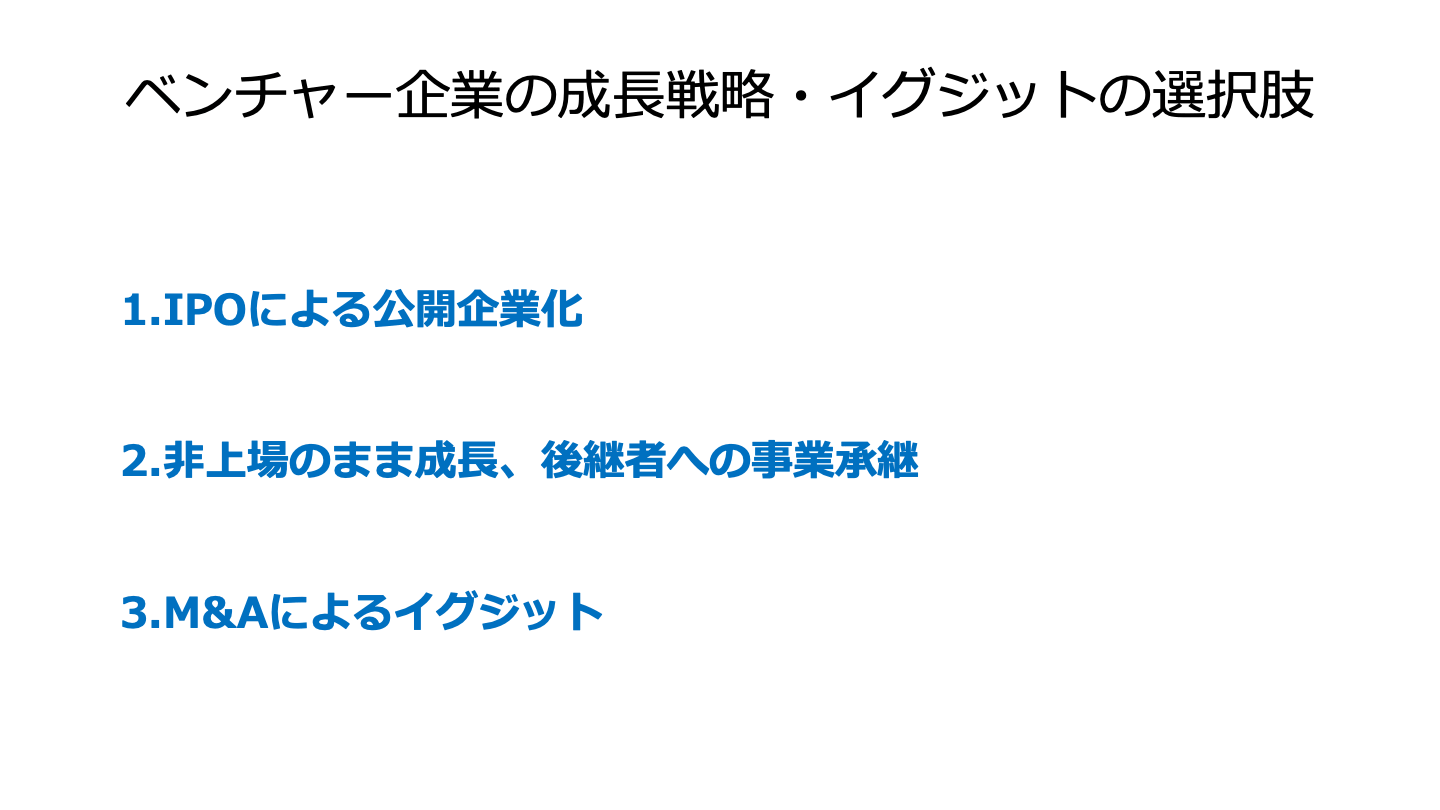 ここではまず、ベンチャー企業(のオーナー経営者)にとってのM&Aの意味合いをイグジット戦略という視点で確認します。