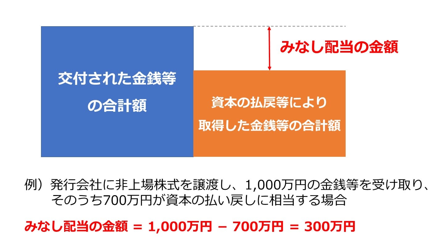 非上場株式(未公開株式)を発行会社に譲渡し、対価として金銭その他の資産を受け取った場合、みなし配当が発生し、実際には配当を受け取っていないのに課税される可能性があります(注1)。