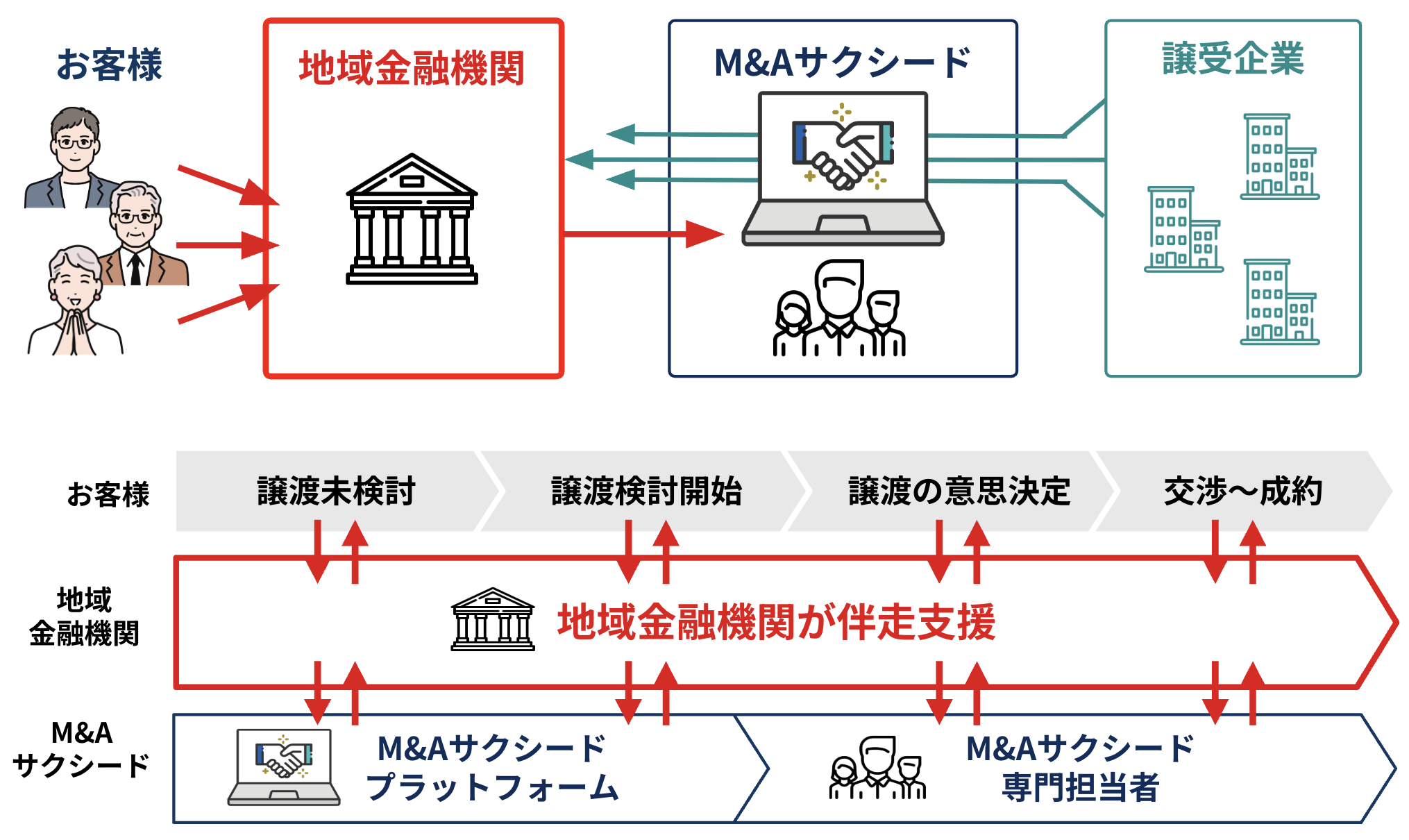 地域金融機関が一貫してお客様との接点を担い続けられるため、信頼関係を維持しながら、自行内マッチングと同時にM&Aサクシード上の全国の買い手とのマッチングが可能になります。これにより、従来の商圏にとらわれずにお客様の選択肢を最大化するとともに、譲受企業探しの長期化を防ぎ、適切なタイミングでのM&Aを支援します。