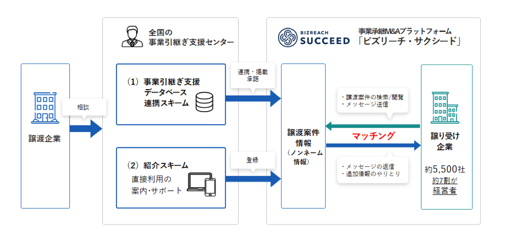 本連携では、全国の事業引継ぎ支援センターが譲渡企業に対して、「ビズリーチ・サクシード」への情報掲載を促進しマッチングをサポートします。